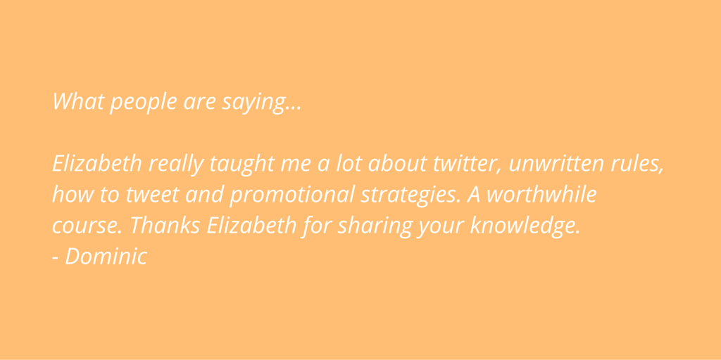 I really enjoyed this course. It had a good flow and I loved the instructors voice. This is definitely the best Twitter course I've taken and I now have useful tools I can use to market my business. I was not sure how to do this before. I enjoyed the teaching style of Elizabeth also. The course was all that Elizabeth said it would be. I'm looking forward to taking more courses with this instructor. - Milly Montamayor